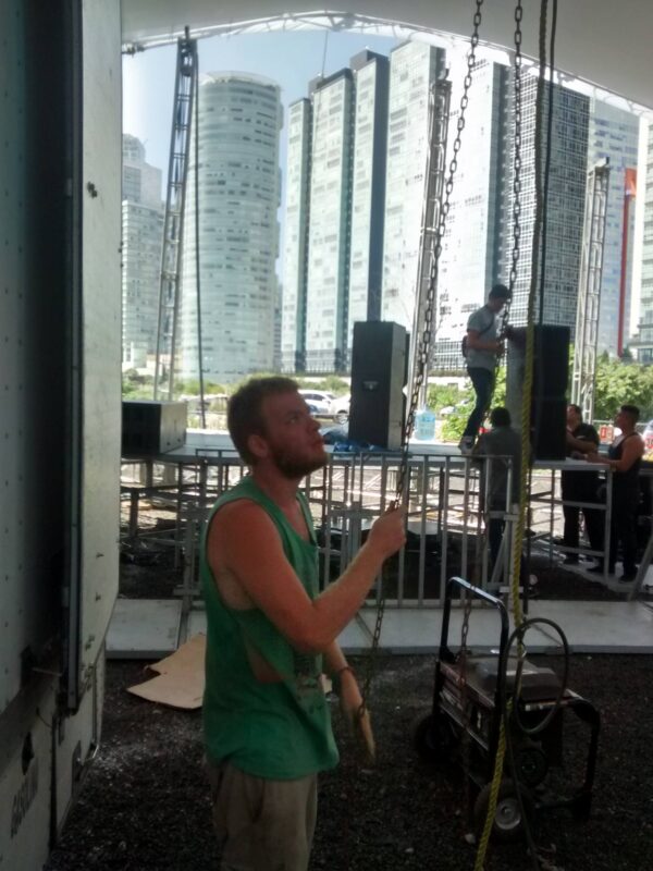 Luis llegó con su primo Edgar, el dueño de una empresa que organiza fiestas electrónicas. Esa noche había que montar una. Sin bañarme, sin dormir, sin haber comido bien, me metí en la tarea: cargar y descargar vallas, colocar parlantes y luces, armar las estructuras. Lo que hiciera falta.
