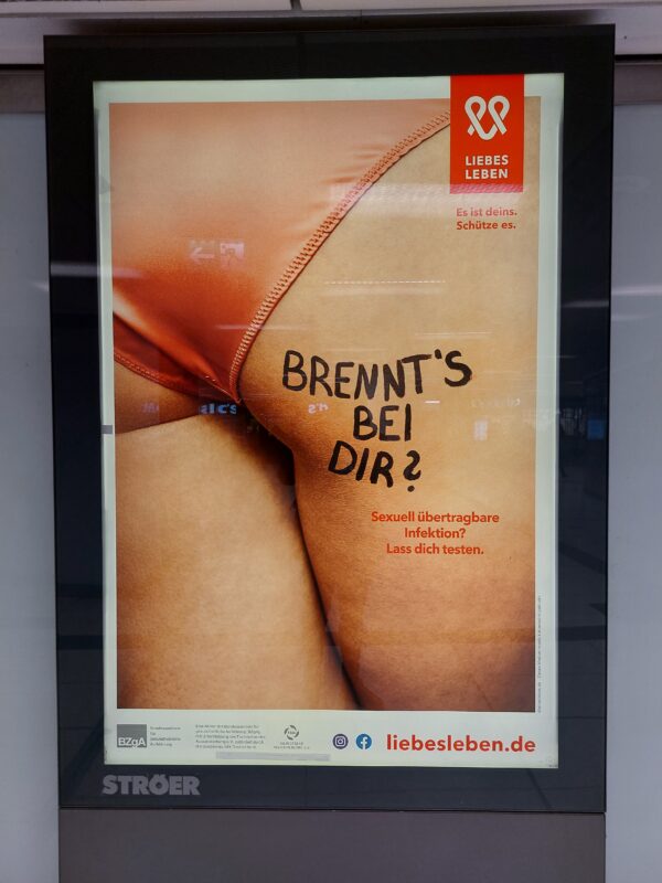 Veo un cartel de publicidad que tiene la foto de una mujer en ropa interior. La frase “Brennt’s bei dir?” está escrita a un lado. Sé que brennt en alemán es arder: lo aprendí por aquella canción de Rammstein que dice “Mein Herz brennt”, o sea, mi corazón arde, y vaya si ardía mi corazón en aquel momento. Busco en Google Lens el significado de la frase. Brennt’s bei dir significa algo así como “¿Te arde?”. Aquel era un cartel de prevención contra una enfermedad de transmisión sexual.