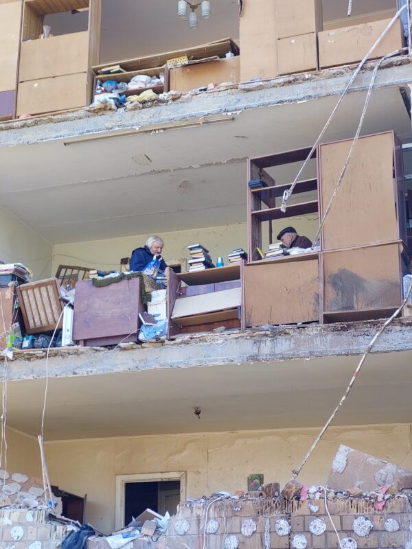 La destrucción se sentía en la nariz antes que en los ojos: olor a plástico derretido, humo, basura podrida. Ahí se había muerto gente. Los edificios de la manzana tenían daños, pero uno se llevó la peor parte. Un cohete ruso voló una pared entera como si fuera una maqueta de telgopor de la escuela. Los departamentos estaban abiertos al aire, desnudos.
