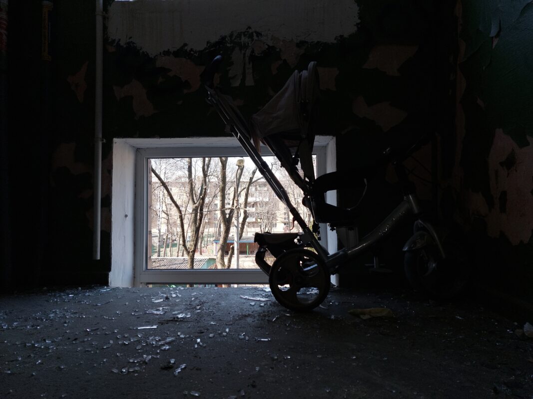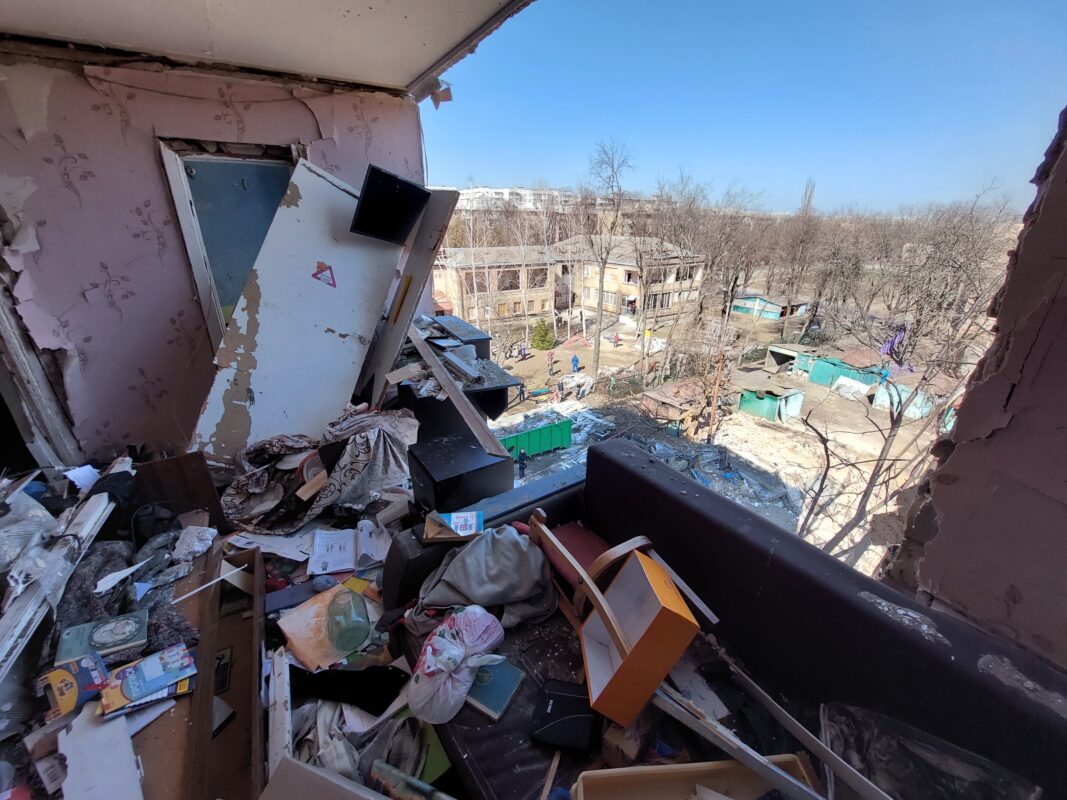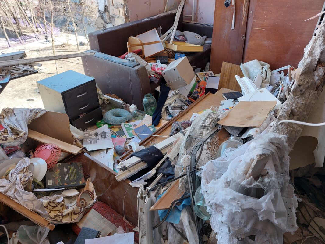 Entré. La escalera estaba llena de vidrios. En un descanso, un triciclo. Adentro, grupos de ucranianos paleaban basura y restos de muebles, mientras periodistas de todo el mundo grababan la escena. Costaba caminar: casi no se veía el piso entre tanto vidrio, metal, papeles, ropa, zapatos, restos de electrodomésticos y tierra. Cada paso crujía. La posibilidad de recuperar algo servible era mínima.