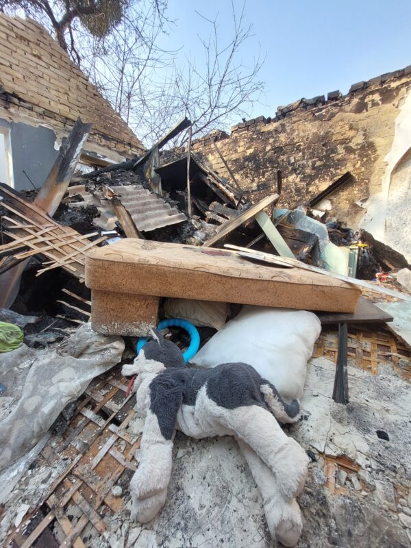 Entre los escombros vi algo que no se me borró más: un perro de peluche, sucio pero entero, tirado en el suelo entre el hollín. Pensé que, tal vez, unos días antes alguien lo había acomodado sobre una cama prolija. Que algún nene o alguna nena lo había abrazado para dormir.